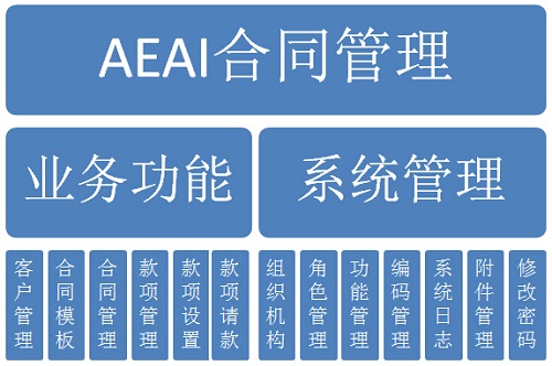 AEAI CM主要包括:客户管理、合同模板、合同管理、款项管理、项目设置、项目请款六个功能模块。