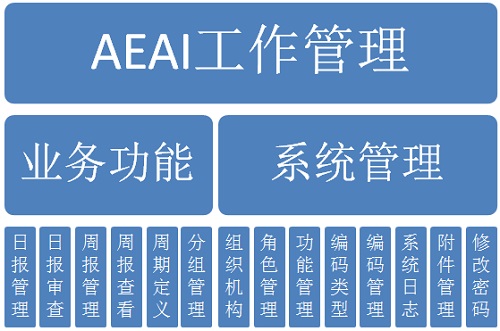 AEAI WM工作管理系统主要包括六个模块,日报管理、日报审查、周报管理、周报查看、周期定义以及分组管理。
