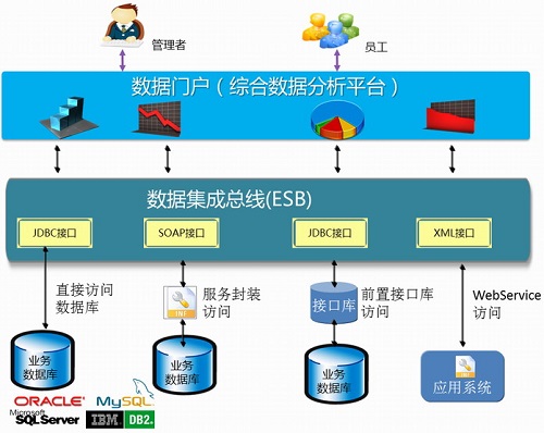 技术架构如下图所示:AEAI ESB应用集成平台在这里以数据集成总线名称出现,主要实现三个核心功能:1、实现部署在不同位置的异构业务系统的数据互联互通;2、为上层的门户平台的图表、表格、仪表盘等组件提供对应格式的数据服务;3、封装Web服务接口为第三方外部系统或者内部系统调用。